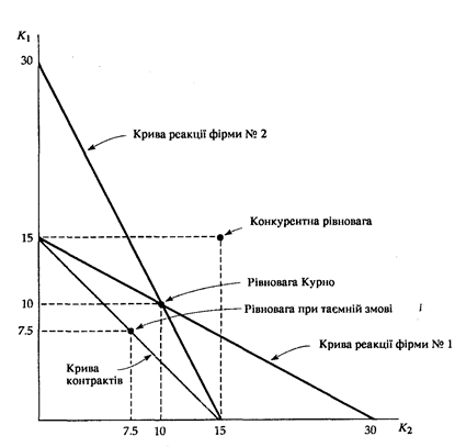 Як і слід очікувати, обидві фірми тепер вироблятимуть меншу кількість — і одержуватимуть більші прибутки, ніж у разі рівноваги Курно. На мал. 1.3 показано цю рівновагу, спричинену змовою фірм, та конкурентні рівні виробництва, що визначаються прирівнюванням ціни до граничних витрат. (Ви можете пересвідчитись, що ці рівні становлять К1 = К2 = 15, а це означає, що кожна фірма одержує нульовий граничний прибуток). Зауважте, що результат Курно значно вигідніший для фірм, ніж абсолютна конкуренція, проте не такий виграшний, як здобуток від таємної змови.