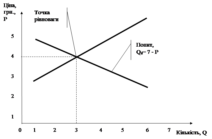 Рівноважна ціна дорівнює 4 грн. Для знаходження обсягу підставляємо рівноважну ціну в рівняння попиту або пропозиції і отримуємо Qs =Qp = 3 одиниці.
