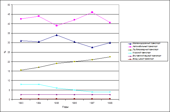 Исследуя динамику структуры рынка транспортной продукции в грузовом сообщении (рис.1) можно придти к выводу о том, что основными конкурентами железнодорожного транспорта являются трубопроводный и автомобильный транспорт. Причем можно предположить, что в ближайшие годы трубопроводный транспорт может “захватить” значительную долю рынка принадлежащую железнодорожному транспорту.