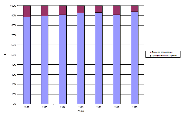 Рис.2 Динамика структуры пассажирских перевозок по видам сообщения на N-ской железной дороге