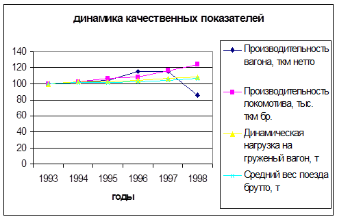 4. Качественные показатели эксплуатационной работы железной дороги несмотря на падение объемов работы не изменились в лучшую сторону. Показатели использования вагонов значительно ухудшились из-за уменьшения среднесуточного пробега вагона увеличилось время простоев под грузовыми операциями и транзитные простои, выросло время оборота вагонов и следствие этого значительное падение производительности вагона. Производительность локомотива наоборот увеличилась правда незначительно. Ухудшение показателей использования вагонов говорит о том, что на дороге имеются большие резервы по улучшению показателей использования вагонного парка.