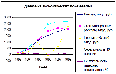 Сокращение объемов перевозок грузов и пассажиров в 1994-96гг. привело к уменьшению доходов железной дороги, при резком увеличении цен на потребляемую дорогой продукцию. Это привело к уменьшению рентабельности издержек производства. Правда в последние два года падение рентабельности было приостановлено и прогноз позволяет судить о возможности дальнейшего улучшения рассматриваемого показателя. Рост экономических показателей в абсолютном выражении обусловлен очень высоким темпом инфляции в рассматриваемом периоде.