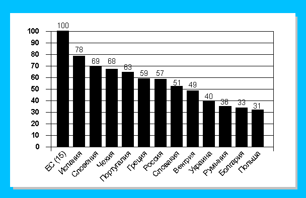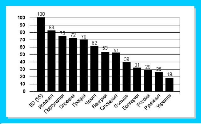 Что касается объема ВВП в расчете на душу населения, он колебался от 7% (в Болгарии) до 44% (в Словении) средней величины для ЕС-15.