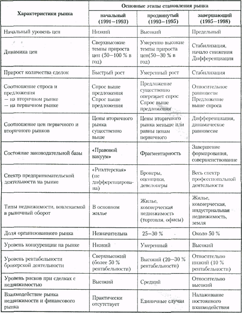 Обобщение опыта становления рынка недвижимости в России позволяет выделить три основных этапа этого процесса, по мере которых рынок начинает приобретать все более и более зрелые черты. Приводимая ниже таблица 2 позволяет проследить, как изменялись некоторые важные характеристики рынка на этих этапах.