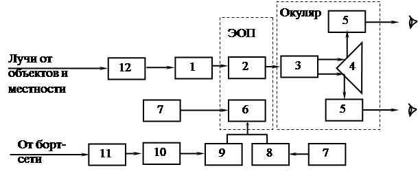 Объектив 1 формирует изображение объектов и местности на фотокатоде ЭОП 2. Усиленное по яркости (ЭОП) и преобразованное по спектральному составу (люминофор) это изображение воспроизводится на экране ЭОП и рассматривается наблюдателем через окуляр изделия с помощью лупы коллиматора 3, разделительной призмы 4 и двух телескопических систем 5, которые могут сдвигаться относительно призмы или раздвигаться в зависимости от величины глазной базы наблюдателя. В конструкцию изделия ЭПМ-53Г-В входят вакуумный блок и ВИП 6 , который имеет устройство автоматической регулировки яркости (АРЯ) экрана (в зависимости от освещенности на местности) и схему защиты ЭОП от световых перегрузок. Для обеспечения работы ВИП и осветителя используется автономный источник питания 7 или бортовая сеть транспортного средства.