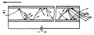 Вторично-эмиссионным усилителем в ЭОП является микроканальная пластина (МКП). Этот элемент представляет собой «сито» с регулярно расположенными каналами диаметром около 10 мкм и толщиной не более 1 мм. Число каналов равно числу элементов изображения и имеет порядок 106 . Обе поверхности МКП полируются и металлизируются, между ними прикладывается напряжение в несколько сотен (или тысяч) вольт. Принцип действия иллюстрирует рис. 4. Попадая в канал, электрон испытывает соударения со стенкой и выбивает вторичные электроны. В тянущем электрическом поле этот процесс многократно повторяется, позволяя получить коэффициент усиления Nх104 раз. Для получения каналов МКП используется разнородное по химическому составу оптическое волокно. После получения шайбы сердцевины волокон растворяются в химических реактивах, образуя множество микроканалов.