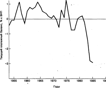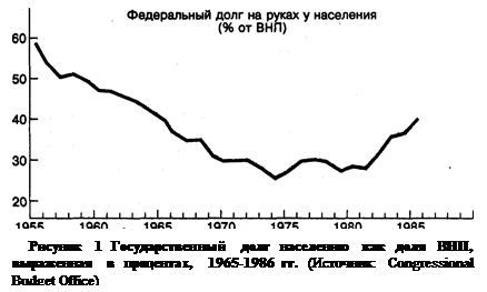 На рисунке 1 представлены ежегодные данные о размере государственного долга США (выраженного в процентах от ВНП[3] ) начиная с 1955 г. К концу 1986 г. общая сумма правительственной задолженности населению составляла около 1389 млрд. долл. С тех пор она продолжала нарастать.