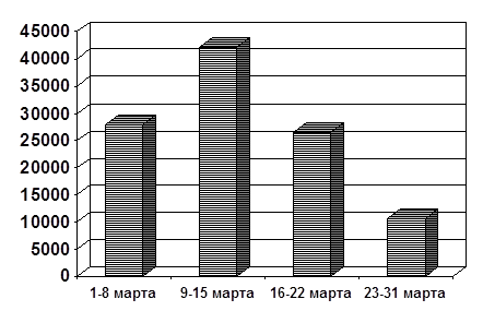 Как видно из данных таблицы 17 и рисунка 5, наибольшее увеличение товарооборота по сравнению с его февральским объемом было отмечено на протяжении первой недели марта, что связано с покупкой подарков к празднику 8-го марта теми, кого заинтересовало рекламное сообщение, затем товарооборот снижается, но все равно его объем за последнюю неделю марта остается большим, чем за неделю в феврале. Отсюда можно сделать вывод, что в противоположность к результатам мероприятий по стимулированию сбыта, эффект от которых имеется только в дни их проведения, рекламные акции оказывают обычно более длительное воздействие на покупателей, позволяя фирме–рекламодателю увеличить объем спроса во время рекламной акции и после нее. Поэтому рассматривать результаты этой рекламной акции следует не только за первую неделю после ее окончания, но за весь март. Делать это в более позднее время не имеет смысла, т.к. рост объемов продаж в апреле незначителен.