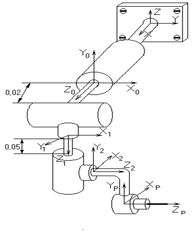 4. Упрощённая конструкция манипулятора со связанными системами координат