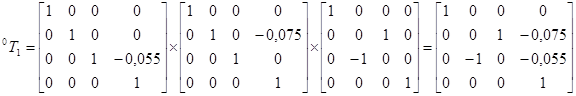 Определение однородной матрицы преобразования для первой точки позиционирования рабочего органа: