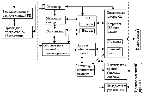 Таким образом, чтобы создать систему, работающую со знаниями и способную в какой-то мере заменить эксперта или помочь ему в принятии решений при управлении производством, необходимо заложить в архитектуру системы возможности по реализации названных функций. На рисунке представлена обобщенная структура и компоненты ПСИИ, а также ее окружение.