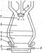 5 -распар; 6 -шахта; 7 -колошник; 8- засыпной аппарат;