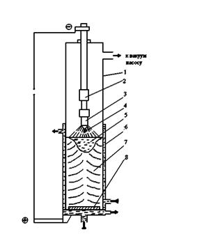 При подаче напряжения между расходуемым электродом-катодом 3 и затравкой-анодом 8 возникает дуга. Выделяющаяся теплота расплавляет конец электрода; капли жидкого металла 4, проходя зону дугового разряда, дегазируются, заполняют изложницу и затвердевают, образуя слиток 7. Дуга горит между расходуемым электродом и жидким металлом 5 в верхней части слитка на протяжении всей плавки. Сильное охлаждение слитка и разогрев дугой ванны металла создают условия для направленного затвердевания слитка, вследствие чего неметаллические включения сосредотачиваются в верхней части слитка, а усадочная раковина в слитке мала. Такие слитки содержат мало газов, неметаллических включений, отличаются высокой равномерностью химического состава, повышенными механическими свойствами. Из слитков изготовляют ответственные детали турбин, двигателей, авиационных конструкций. Масса слитков достигает 50 т.