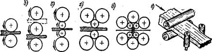 Прокатка заготовок на трехвалковых станах (рис. 136, б) ведется в одну сторону между нижним и средним валками, в другую – между средним и верхним; направление вращения валков постоянное. В четырех- и шестивалковых станках (рис. 136, в, г) верхние и нижние валки являются опорными, они препятствуют прогибу средних рабочих валков; эта схема применяется для листовых станов.