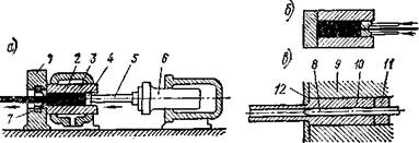 Прутки сплошного сечения получают как прямым, так и обратным прессованием. Прессование труб (рис. 138, в) производят только прямым методом, при этом заложенный в контейнер 9 слиток 10 предварительно обжимается пресс-шайбой 11, а затем прошивается дорном 8, конец которого доходит до отверстия матрицы 12. При прессовании металл вытекает из кольцеобразного калибра, составленного отверстием матрицы и дорном, в результате чего образуется труба.