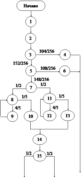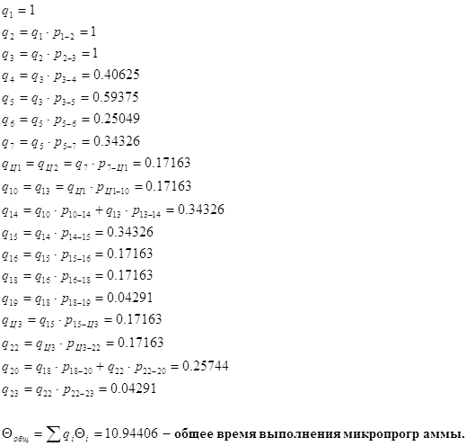 В графе имеются три цикла: 8-9, 11-12, 17-21. Будем считать, что количество итераций циклов 8-9 и 11-12 равно 5, а цикла 17-21 – 3. Таким образом, время выполнения циклов 8-9 и 11-12, имеющих по две вершины, равно 10, а цикла 17-21 – 6. Теперь рассчитаем вероятности выполнения каждой вершины, заменив циклы вершинами: 8-9 – Ц1, 11-12 – Ц2, 17-21 – Ц3.