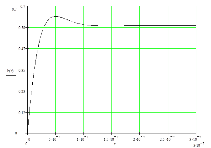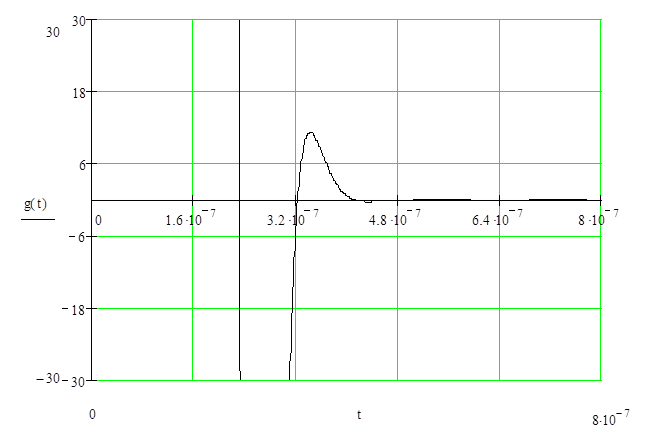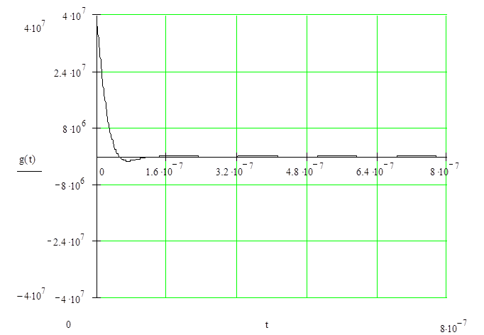 Поскольку данный график содержит ось времени от 0 до t1, да плюс, как мы увидели по переходной характеристике, затухание происходит очень быстро, увидеть в таком масштабе колебания нельзя. На рисунке 3.8 ось времени содержит значения от 0 и до 2*10^-7 секунд, на этом графике хоть и слабо, но все же видно, что нарастание вначале нелинейное.