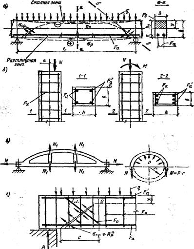 В изгибаемых и внецентренно нагруженных элементах в местах действия поперечных сил возникают главные растягивающие sГ. Р напряжения, которые уже не могут восприниматься продольной арматурой растянутой зоны. Если такие места не заармировать, то появятся наклонные трещины примерно под углом 45°. Для воспринятая главных растягивающих напряжений и предотвращения образования трещин в балках, например, ставят хомуты или поперечные стержни, а при необходимости и нижнюю продольную арматуру отгибают под углом 45—60° вверх с заделкой в сжатой зоне бетона (рис. 1.1, г). Таким образом, соединенные бетон и стальные стержни создают качественно новый материал — железобетон (или точнее сталебетон), область применения которого практически не ограничена.