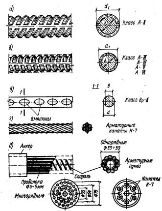 г) по способу армирования — с обычным армированием (каркасами, сетками и отдельными стержнями) и предварительным напряжением арматуры из высокопрочных стержней, проволоки или арматурных канатов.
