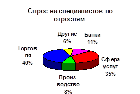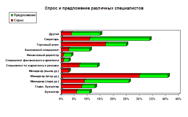 Спрос на другие специальности продолжает оставаться более-менее стабильным. Данные исследований московского рынка труда показывают, что наибольшей популярностью по-прежнему пользуются менеджеры среднего уровня ( на них приходится 30% спроса при 11% предложения ), торговые агенты ( соответственно 13% и 8% ) и т.д. К особо дефицитным специальностям можно отнести менеджеров ( спрос 3% при нулевом предложении ). В тоже время продолжает снижатся спрос на секретарей-референтов: в начале года на их долю приходиллось 20% от общего спроса, а к сентябрю - 11% при предложении 23%. Причина недовольство работодателей общим уровнем квалификации работниц, которые всегда подбирались преимущественно по внешним данным.