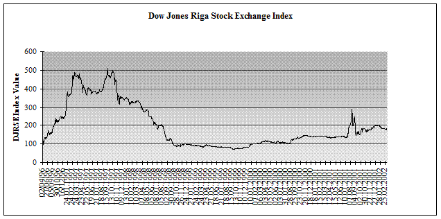 Как свидетельствует Рижская Фондовая Биржа, ценность индекса DJ с 31 июля 1998г. по 31 августа упала с 200 пунктов до 120 пунктов- на 40%.