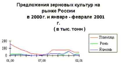 С учетом изложенного положения на внутреннем рынке зерна России и на мировом рынке можно сделать вывод о том , что это создало определенные предпосылки для увеличения предложений на рынке зерна . Если говорить о внутреннем рынке , то особенно предложение зерна на продажу возросло начиная с августа 2000 года , т.е. с поступлением зерна нового урожая . Например , по данным Минсельхозпрода РФ предложения регионов на вывоз пшеницы в августе - декабре 2000 года составляли около 75 тыс. тонн ежемесячно . Львиную долю в этих предложениях занимал Ставропольский край (45 - 50 тыс. тонн). По ржи предложения колебались в пределах 10 - 20 тыс. тонн , где ведущее место занимала Республика Марий - Эл (2000 тонн). По ячменю предложения на вывоз из регионов - производителей особенно возросли в ноябре - декабре 2000 года ( до 50 - 60 тыс. тонн) , в основном за счет Тульской области ( 40 тыс. тонн ) . Аналогичное положение отмечается по овсу , где за этот же период предложения возросли до 25 - 30 тыс. тонн, особенно по Алтайскому краю (20 тыс. тонн). По мере реализации зерна отмечается снижение предложений его на рынок, но в целом положение остается стабильным , т.к. вслед