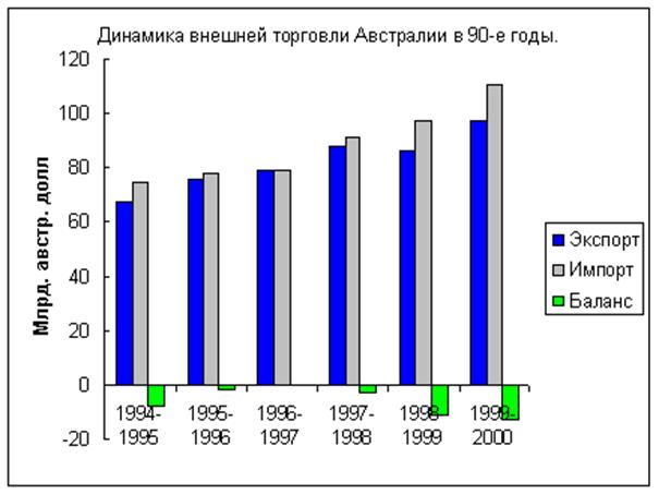 В 1999-2000 годах объем внешней торговли Австралии возрос на 13 % и составил 207 млрд. Австралийских долларов. В связи с тем, что темпы роста импорта опережали темпы роста экспорта, отрицательный баланс увеличился с 11,6 млрд. долларов в 1998-1999 годах до 13 млрд. (диаграмма[3] ).