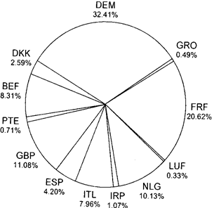 Рис.1. Удельные веса участвующих в «корзине» ЭКЮ валют*.