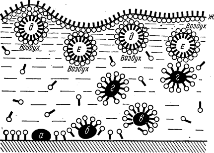 а — грязевая частица на поверхности материала; б — адсорбция моющего вещества на частице грязи; в — отрыв частицы грязи от отмываемой поверхности; г — частица грязи в моющем растворе; д — пузырьки воздуха с адсорбированными молекулами моющего вещества (пена); Е — слипшиеся пузырьки пены и частицы грязи; ж — адсорбционный слой моющего раствора на границе раздела воздух — вода