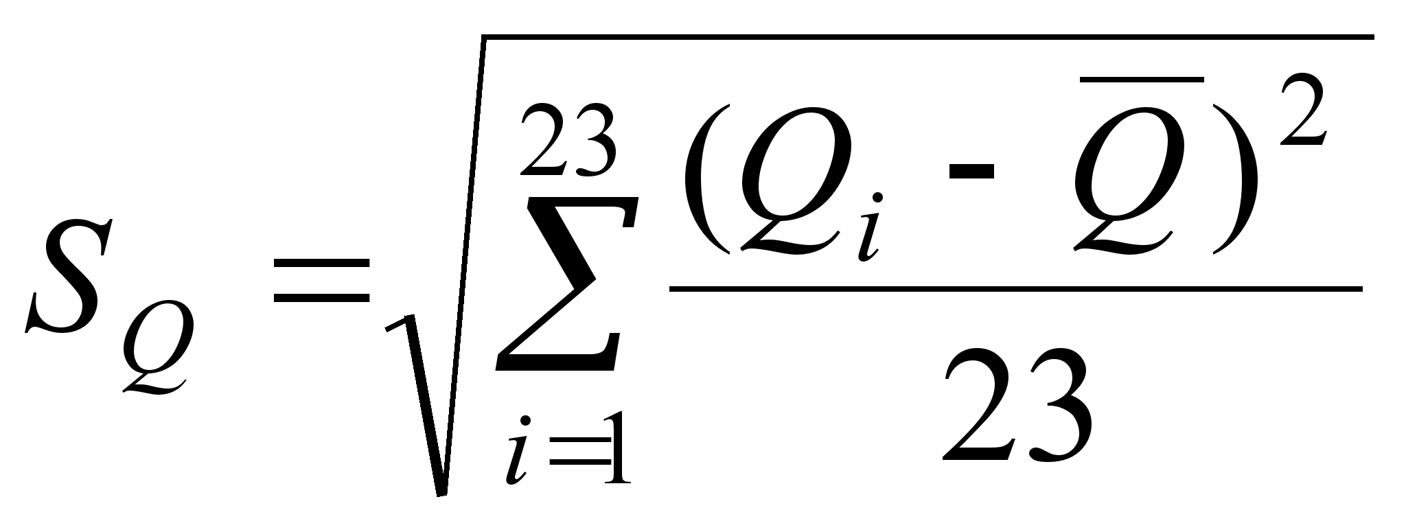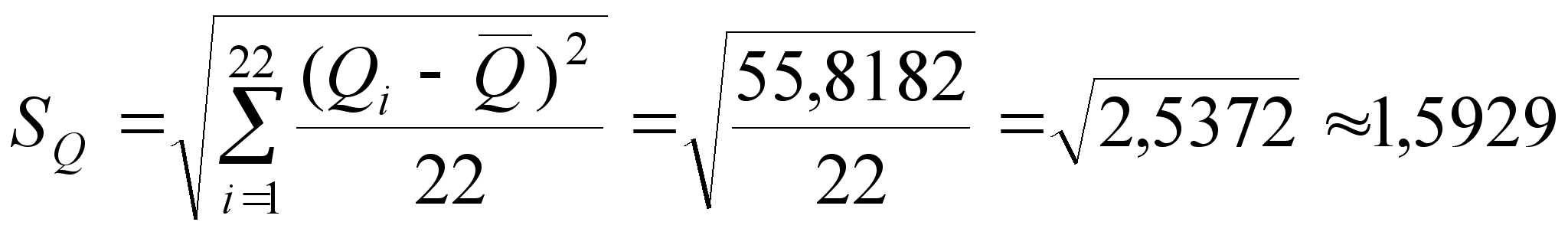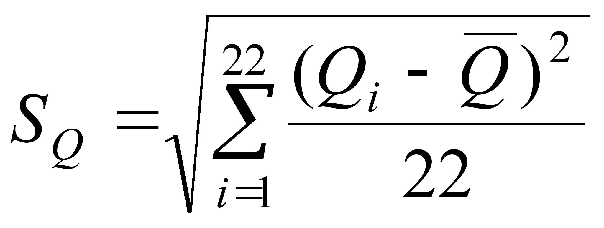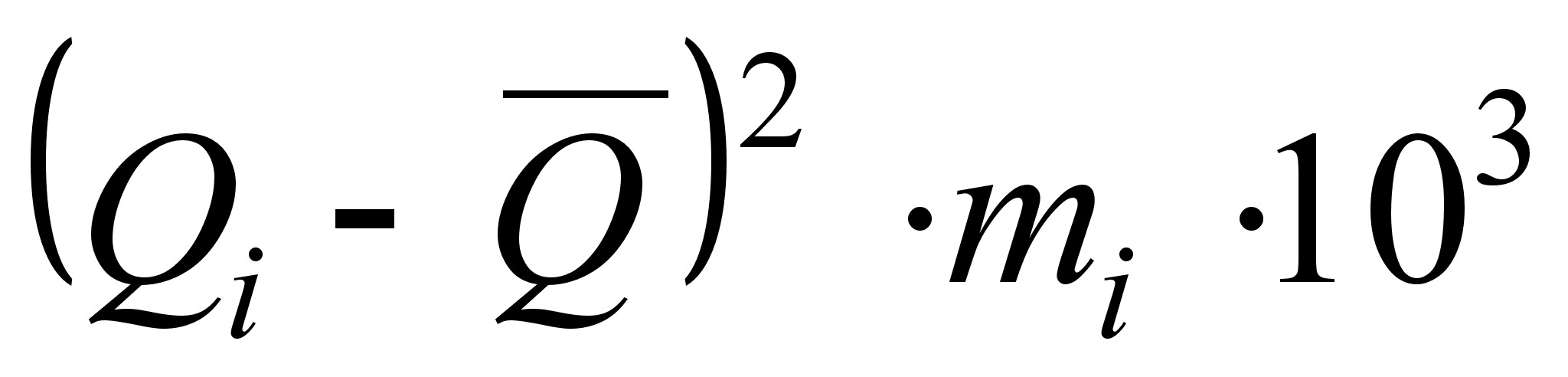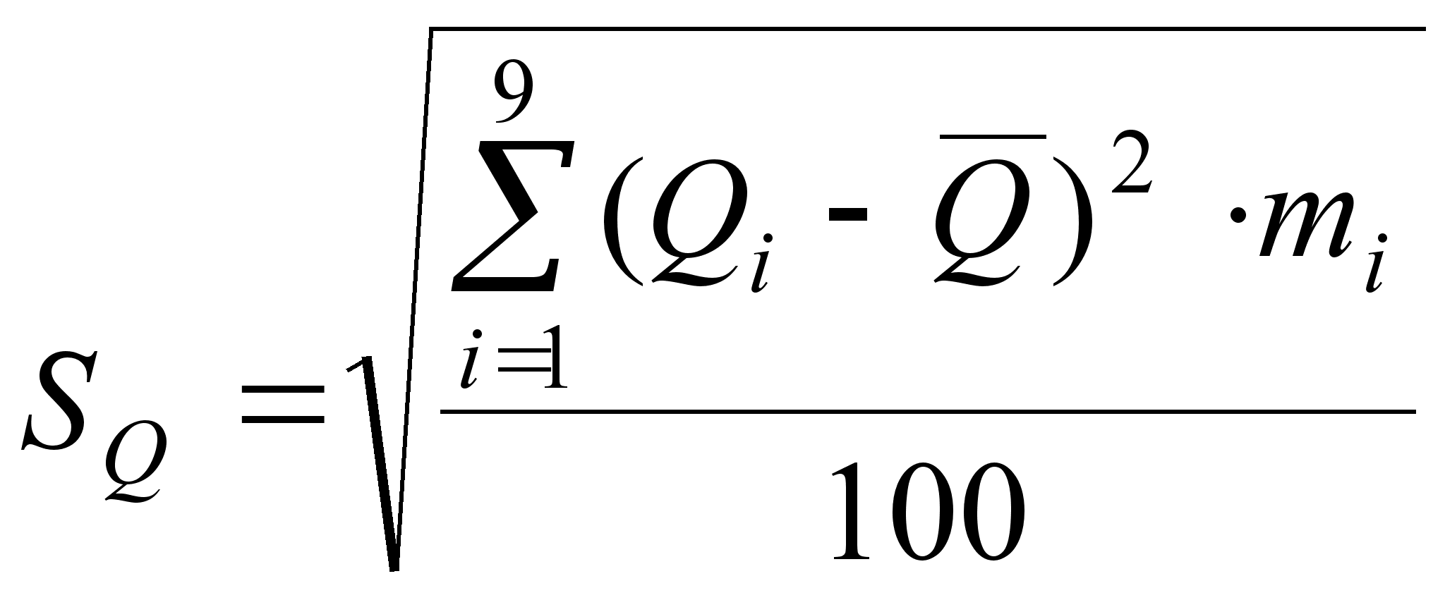 Результаты измерения Qi разбиваем на 9 групп через установленные интервалы с указанием абсолютной частоты (mi) появления результата измерения внутри каждого интервала. Данные располагаем для удобства расчетов в форме таблицы (таблица 12), заполняемой по мере проведения расчетов.