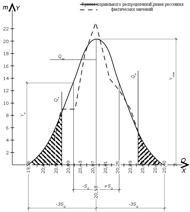 При проведении исследования, чтобы составить графики и определить, на сколько полученная кривая рассеяния фактических результатов измерения приближается к теоретической кривой нормального распределения, обе кривые надо начертить совмещёнными в одинаковом масштабе. С этой целью рассчитаем данные, необходимые для построения кривой нормального распределения. Для сокращения расчетов и упрощения примерного построения кривой нормального распределения можно ограничиться определением только трех параметров: максимальной ординаты Ymax (при X = 0), ординаты для точек перегиба Yσ (при X = ±SQ) и величины поля рассеяния.