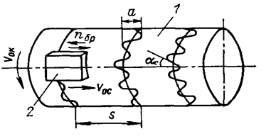 / — деталь; 2 — брусок ( V .— окружная скорость детали. S —осевая подача, Оос — скорость осевой подачи, n — частота колебании бруска, а — размах колебаний, ас — угол сетки).