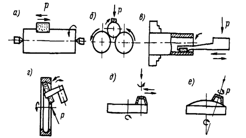 Рис. 1.7. Схемы суперфиниширования деталей различной конфигурации: а—цилиндрических и конических (в центрах), б—цилиндрических и пологих конических (на опорных валках); в—отверстии; г— внутренних сферических поверхностей; д — плоских торцовых поверхностей, е — выпуклых торцовых поверхностей