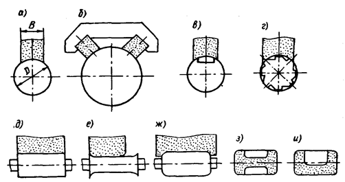 В ряде случаев для повышения точности геометрической формы детали в средней части рабочей поверхности бруска делают вырезы (рис. 4.1,з, и).
