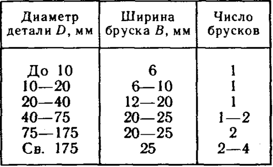 Для обработки деталей больших диаметров следует применять два бруска (рис. 4.1, б) и более, используя для этого специальные державки. В табл. 4.7 приведены данные по выбору оптимальных ширины и числа брусков при суперфинишировании в зависимости от диаметра детали. При обработке деталей со шпоночными канавками, пазами, окнами ширина бруска должна быть не менее полуторной ширины канавки или паза (рис. 4.1, в), а при обработке разверток (рис. 4.1, г)