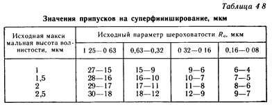 В табл. 4.8 приведены значения припусков на суперфиниширование в зависимости от исходных волнистости и шероховатости. При необходимости удаления дефектного слоя металла, превосходящего высоту неровностей шероховатости, припуск следует увеличить на глубину этого слоя.
