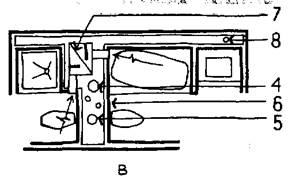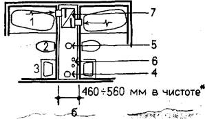 | 1— ванна; 2— унитаз; 3— умывальник; 4— вентиляционный стояк; 5— канализационный стояк; 6— стояки вентиляционного и горячего водоснабжения; 7—каналы вытяжной вентиляции; 8—стояк бытовой канализации (не фекальной); 9— раковина; 10— стояки бытовой канализации и канализационной вентиляции |