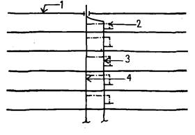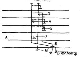 | 1— крыша; 2— раковин»; 3— стояк бытовой канализации; .4— стояк канализационной вентиляции; 5— дополнительный стояк бытовой канализации; 6—нижний жилой этаж; 7—самая нижняя раковина канализуется в вентиляционный стояк; 8— параллельный участок (3 м) |