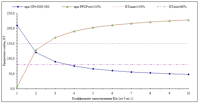 На рис.2 при n=4.5 видна точка пересечения графиков, в которой годовая рентабельность собственного капитала PFCPwn одинакова при различных значениях коэффициента заимствования Kln.