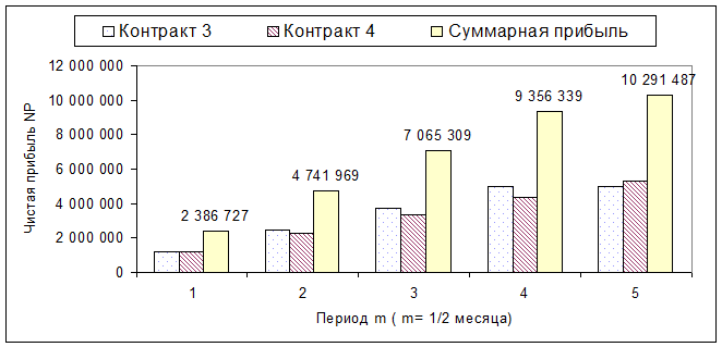 Для того, чтобы посмотреть, каким образом будет происходить выполнение контрактов 3 и 4 по периодам, построим график зависимости прибыли внешнеэкономической операции