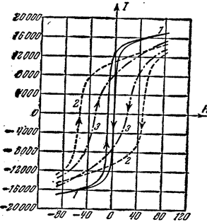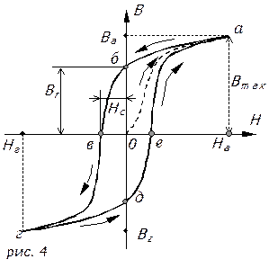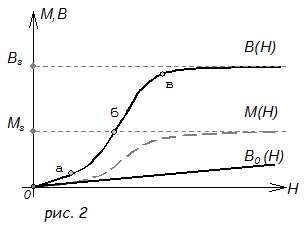 Намагніченість М феромагнітного матеріалу росте тільки до граничного значення, називаного намагніченістю насичення Мs. Залежність намагніченості М від напруженості поля М(H) показана на мал. 2 штриховою лінією. На тім же малюнку показана лінійна залежність B0(H)=0М. Складаючи ординати кривій 0М(H) і прямій М0(H), одержуємо ординати новій кривій B(H) - кривій первісного намагнічування (рис 2). Криву B(H) можна розділити на чотири ділянки :