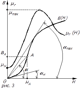 Абсолютна магнітна проникність ферромагнетика визначається для довільної крапки А кривої намагнічування (мал. 3) через тангенс кута нахилу січної 0А к осі абсцис, тобто
