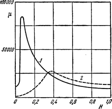 Крива зміни магнітної проникності r для феромагнітного матеріалу дана на тім же мал. 3. Як видно з графіка, магнітна проникність з ростом напруженості поля змінюється в досить широких границях, що утрудняє її застосування для розрахунків. На кривій Мr(H) відзначають два характерних значення магнітної проникності:
