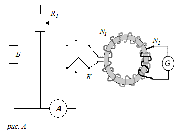 Тороід, первинна обмотка якого складалася з N1 витків, мав сердечник з досліджуваного матеріалу (наприклад, відпаленого заліза). Вторинна обмотка з N2 витків була замкнута на балістичний гальванометр G (мал. А). Обмотка N1 включалася в ланцюг акумуляторної батареї Б. Напруга , прикладена до цієї обмотки, а, отже, і силу струму І1 у ній можна було змінювати за допомогою потенціометра R1. Напрямок струму змінювалося за допомогою комутатора К.