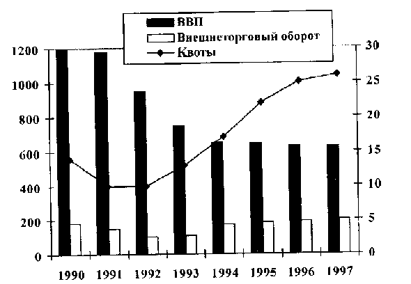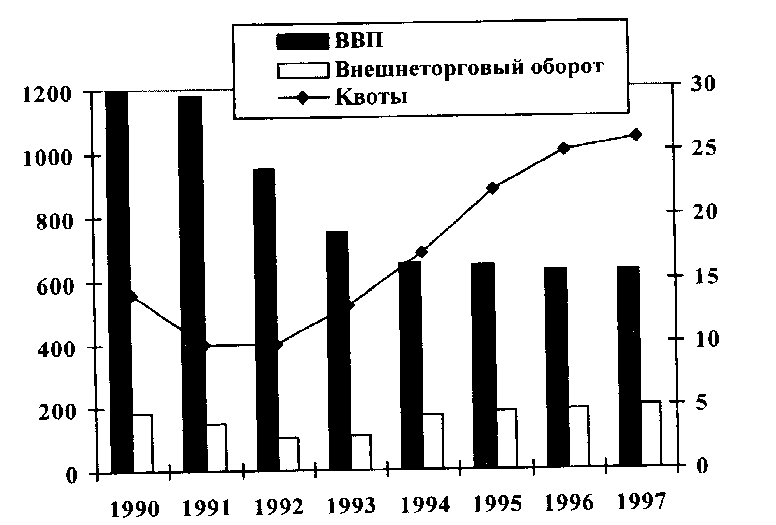 С началом реформ положение стало меняться: после некоторого спада в 1991-1992 гг. внешнеторговая квота России начала расти, а с 1992 г. по 1997 г. она повысилась в 2,4 раза (см. рис. 1).
