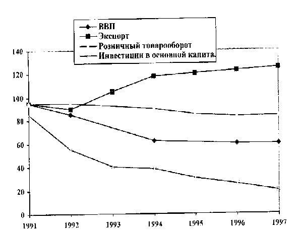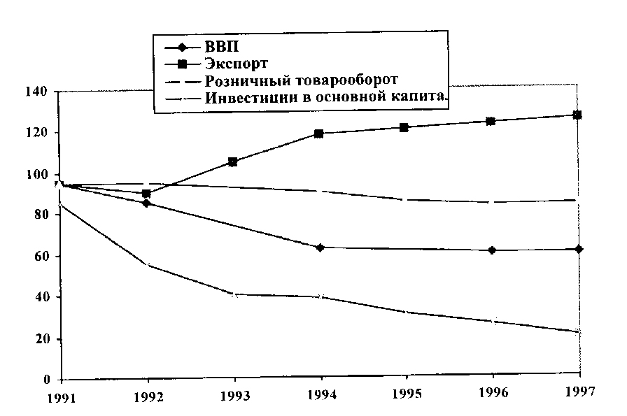 Индексы ВВП, экспорта, внутреннего потребительского и инвестиционного спроса в России в 1991-1997 гг
