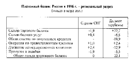 Торговый баланс, активный в 1994 - 1995 гг., сменился в 1996 г. пассивом, поскольку Россия получила от стран СНГ несколько больше товаров, чем отдала взамен. Напротив, по балансу услуг, пассивному п предыдущие годы, образовался небольшой актив, уменьшивший, хотя и не устранивший пассивный результат по всей группе текущих операций.