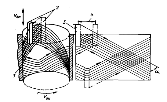 1 — деталь; 2 — брусок; 3 — перебег; 4 — перекрытие (Vок — окружная скорость, Vвп — скорость возвратно-поступательного движения, αс — угол сетки)