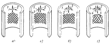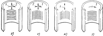 Дальнейшим развитием рассмотренных схем является хонингование с одновременно вводимыми осевой и круговой осцилляцией. Подобная схема обработки впервые была предложена в Пермском политехническом институте на основе использования кинематики плоскодоводочного станка с растровой траекторией. Траектории движения режущих зерен при различной кинематике хонингования показаны на рис 2. Обычная схема хонингования (рис 2, а) характеризуется типичной сеткой следов обработки в виде пересекающихся винтовых линий Траектории движения режущих зерен при наличии осевого или кругового осциллирования по синусоидальному закону представлены на рис. 2, б, в Они образу-