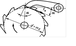 колеса, для надежного функционирования храпового механизма также необходимо выполнять неравенство к > j, что может быть обеспечено, когда ось, наоборот, находится ближе к оси колеса, а собачка сделана достаточно длинной. При этом момент силы Fn прижимает собачку к храповому колесу. Соответствующее направление нормальной силы Fn можно обеспечить поднутрением передней грани зубьев храпового колеса на угол a. Тогда ось собачки может располагаться на касательной к средней окружности зубьев храпового колеса (рис. 2). Для обеспечения прижатия собачки к зубьям храпового колеса в этом случае необходимо, чтобы угол поднутрения был больше угла трения. Часто a выбирается равным 10°. У этой конструкции при малом окружном шаге зубьев зуб храпового колеса получается ослабленным.